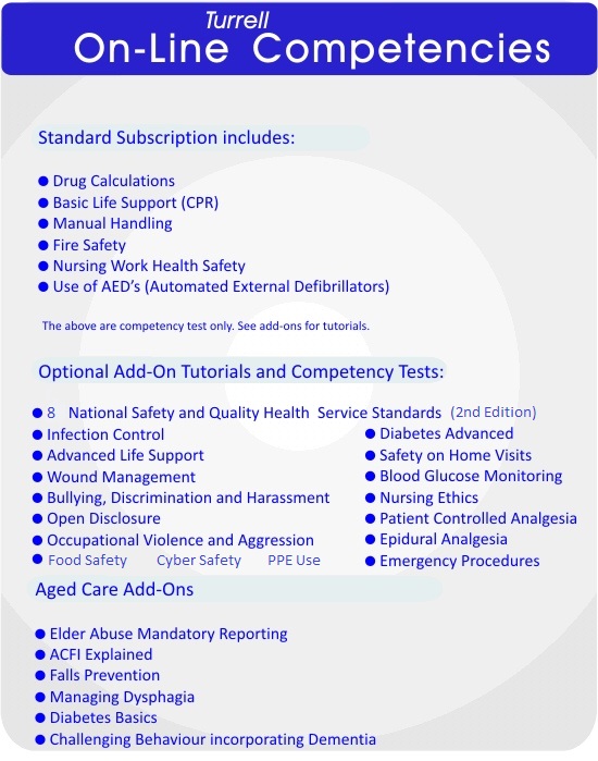New Topics: Food Safety, Privacy and Cyber Safety, 2nd Edition NSQHS Standards Staff require only the most basic level of computer literacy to use this website. All competency tests are marked automatically. All staff results can be accessed by a designated educator/administrator via a supplied password. A personal CPD record is held for each clinical user which can also include face to face sessions. Educators can troubleshoot by viewing every question of every test completed. Reasonably priced subscription fees are relative to the number of staff who will access the site. Staff can complete training from work or home. Free trial available. Click here for more information... |